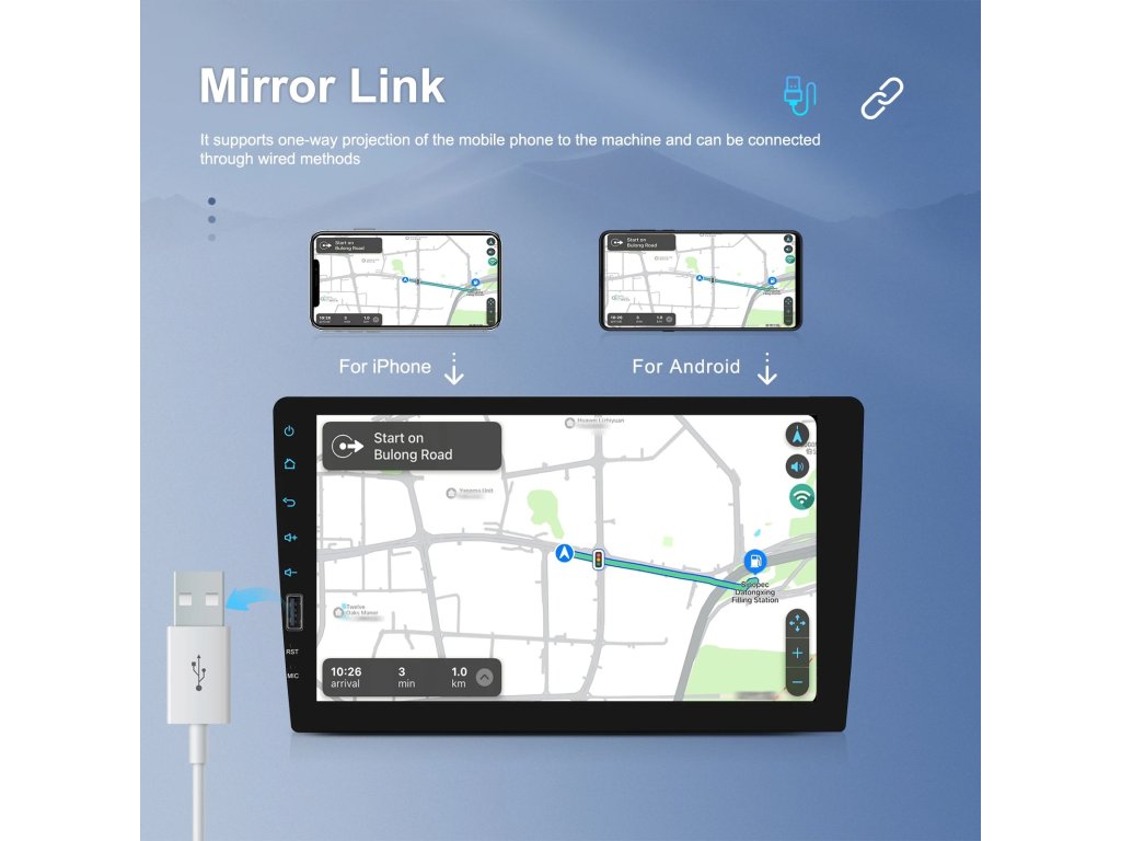 Funkce USB MirrorLink umožňuje snadné promítání obsahu vašeho telefonu na displeji autorádia. Tento inovativní prvek umožňuje například sdílení GPS navigace z vašeho mobilního zařízení na displeji vašeho 2DIN autorádia. Možnost sdílení obrazovky telefonu přes tuto funkci je praktickým a užitečným řešením.