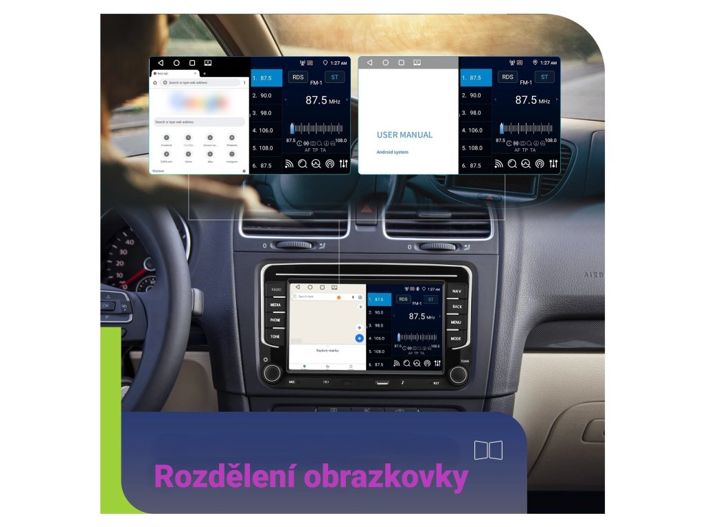●Funkce rozdělené obrazovky: lze zobrazit dvě stránky současně, například zobrazení navigace a hudby současně