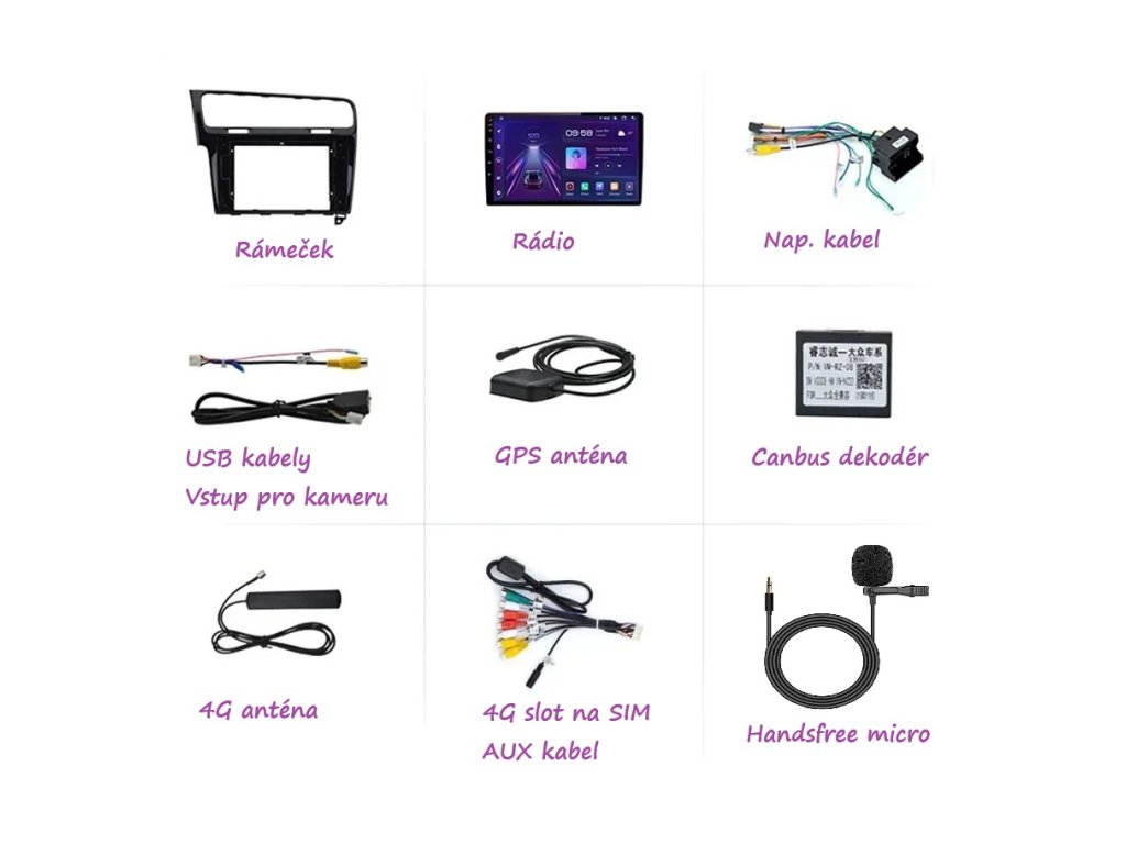 4GB RAM / 64GB ROM, IPS display, Funkce: Wifi, Bluetoth 4.5, GPS , Canbus, DVR, Tpms, ovladaní volantem, 2X USB, čeština, Carplay / Android Auto, Mirror link