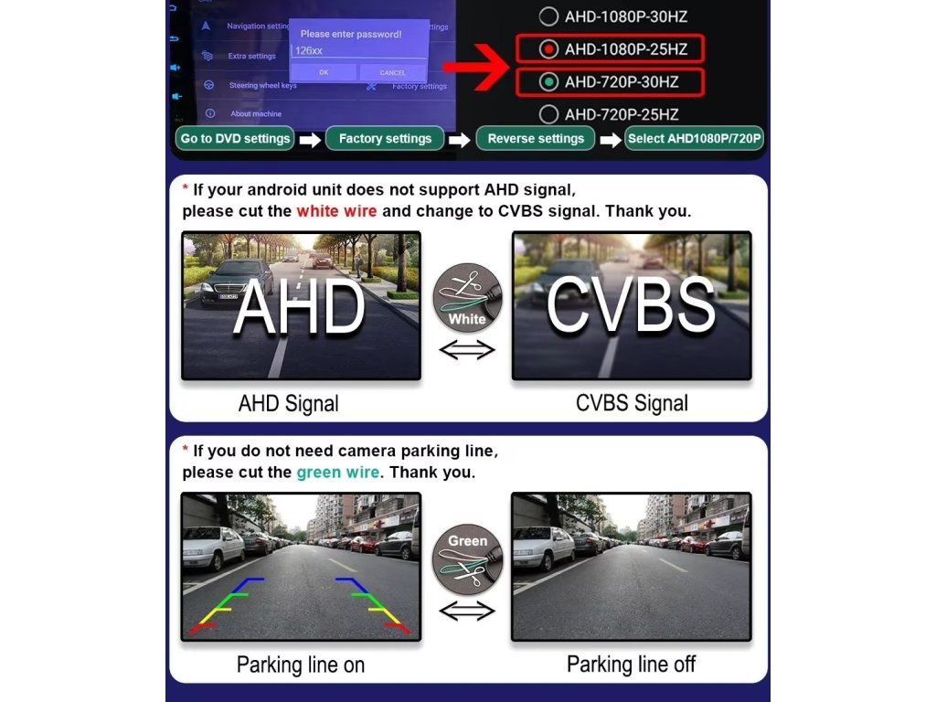 Instalace kamery spočívá s nahrazení původní lampičky, zapojení napájení, zapojení signálu obrazu (doporučujeme sadu pro bezdrátový přenos který nahradí tažení koaxialního kabelu od kamery k rádiu)