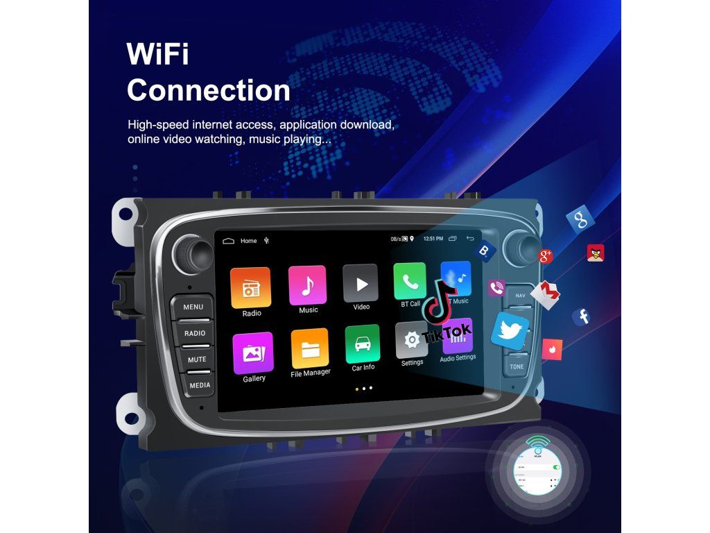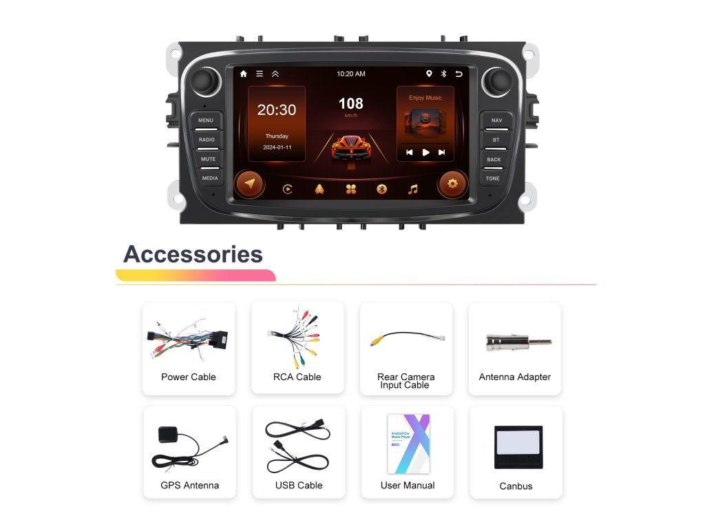 ●FM/AM/RDS rádio: Online hudbu lze přenášet do autorádia přes FM, abyste si mohli vychutnat originální autorádio, 30 přednastavených rozhlasových stanic, špičkový rádiový čip, výkonnou redukci šumu a schopnost proti rušení, podpora FM/AM Funkce RDS, Jasné vyhledávání kanálů a nízký šum