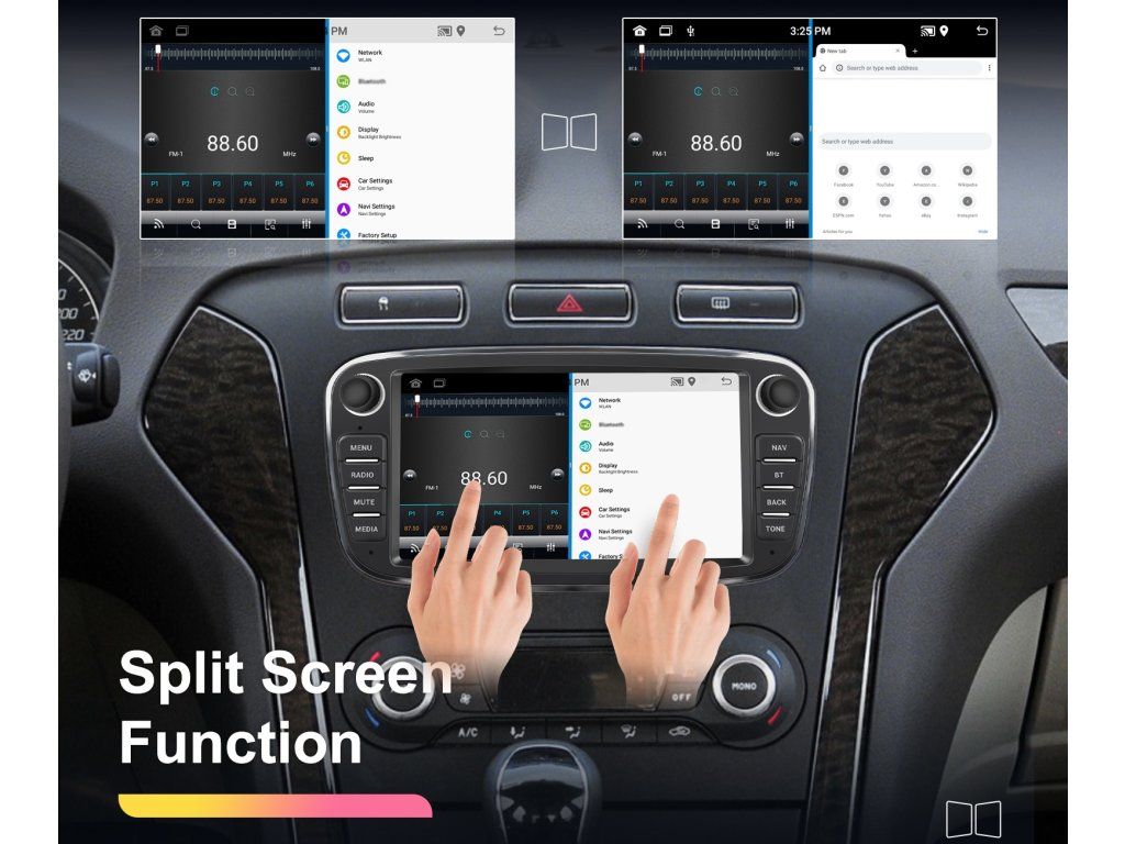 ●Funkce rozdělené obrazovky: lze zobrazit dvě stránky současně, například zobrazení navigace a hudby současně