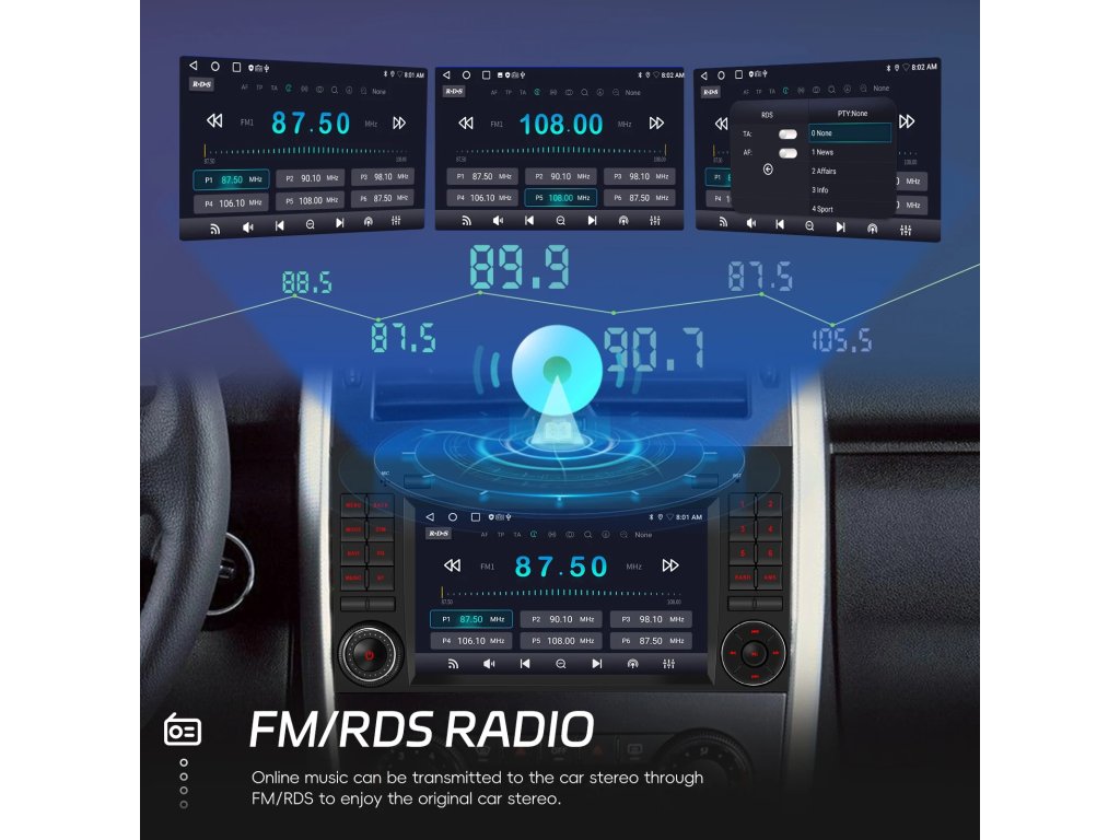 ●FM/AM/RDS rádio: Online hudbu lze přenášet do autorádia přes FM, abyste si mohli vychutnat originální autorádio, 30 přednastavených rozhlasových stanic, špičkový rádiový čip, výkonnou redukci šumu a schopnost proti rušení, podpora FM/AM Funkce RDS, Jasné vyhledávání kanálů a nízký šum